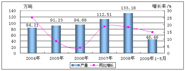 2004-2009年云南省饲料产量及增长对比图