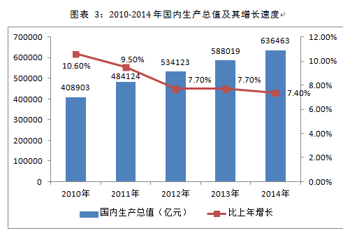 在复杂的环境中,我国经济保持较快的增长势头。初步核算,2014年全年国内生产总值636463亿元,比上年增长7.4%。其中,第一产业增加值58332亿元,增长4.1%;第二产业增加值271392亿元,增长7.3%;第三产业增加值306739亿元,增长8.1%。第一产业增加值占国内生产总值的比重为9.2%,第二产业增加值比重为42.6%,第三产业增加值比重为48.2%。经济的快速增长为qled显示面板产业的发展提供了良好的宏观经济环境。