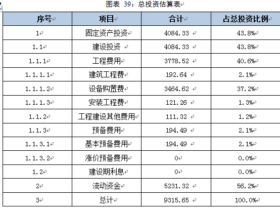 本项目总投资9315.65万元,其中固定资产投资为4084.33万元,流动资金为5231.32万元。项目总投资估算详见下表。