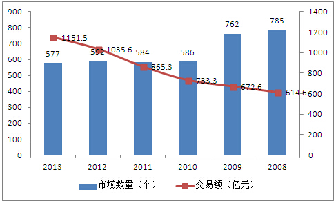 图表 3:2008-2013年河北省农产品交易市场数量及交易额变化趋势