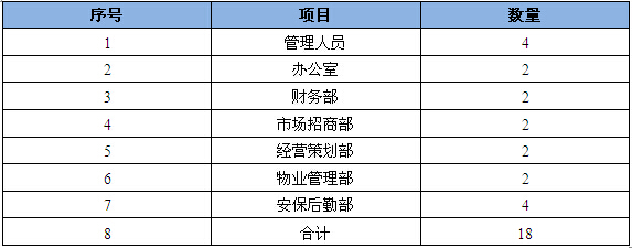 本项目运营期间,本项目劳动定员为18人,主要包括管理人员、财务人员、市场招商人员、经营策划人员、信息管理人员、物业管理人员以及保安、保洁、维修工、行政等后勤人员,定员数量如下表所示: