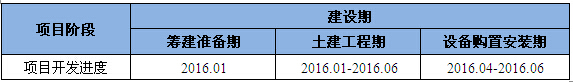 根据本项目的建设规模、实施条件以及建设的迫切性和项目建设的外部条件等各种因素,并综合项目总体发展目标,确定建设工期为0.5年。开发建设分为3个阶段:筹建准备期、土建工程期和设备购置安装期。为缩短建设工期,项目不同阶段可交叉进行。