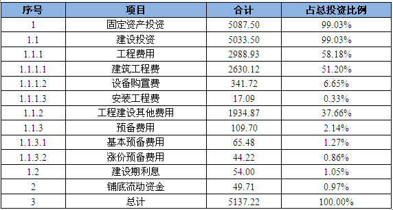 本项目总投资5137.22万元,其中,建设投资金额为5033.50万元,建设期利息54.00万元,铺底流动资金为49.71万元。